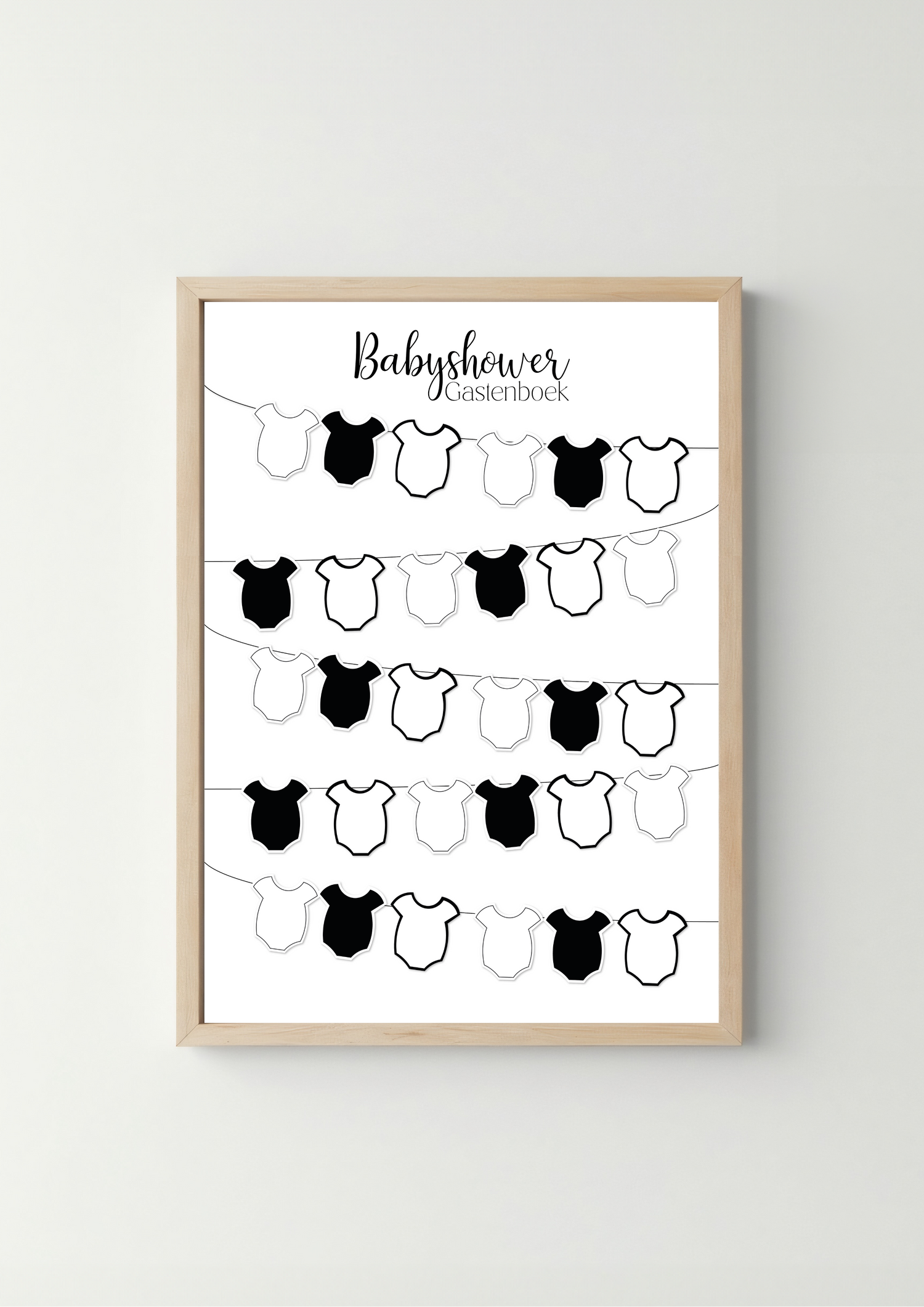 Deze minimalistische gastenboek vlaggenlijn met zwart-witte rompertjes is een liefdevolle manier om wensen en adviezen voor de baby vast te leggen.
