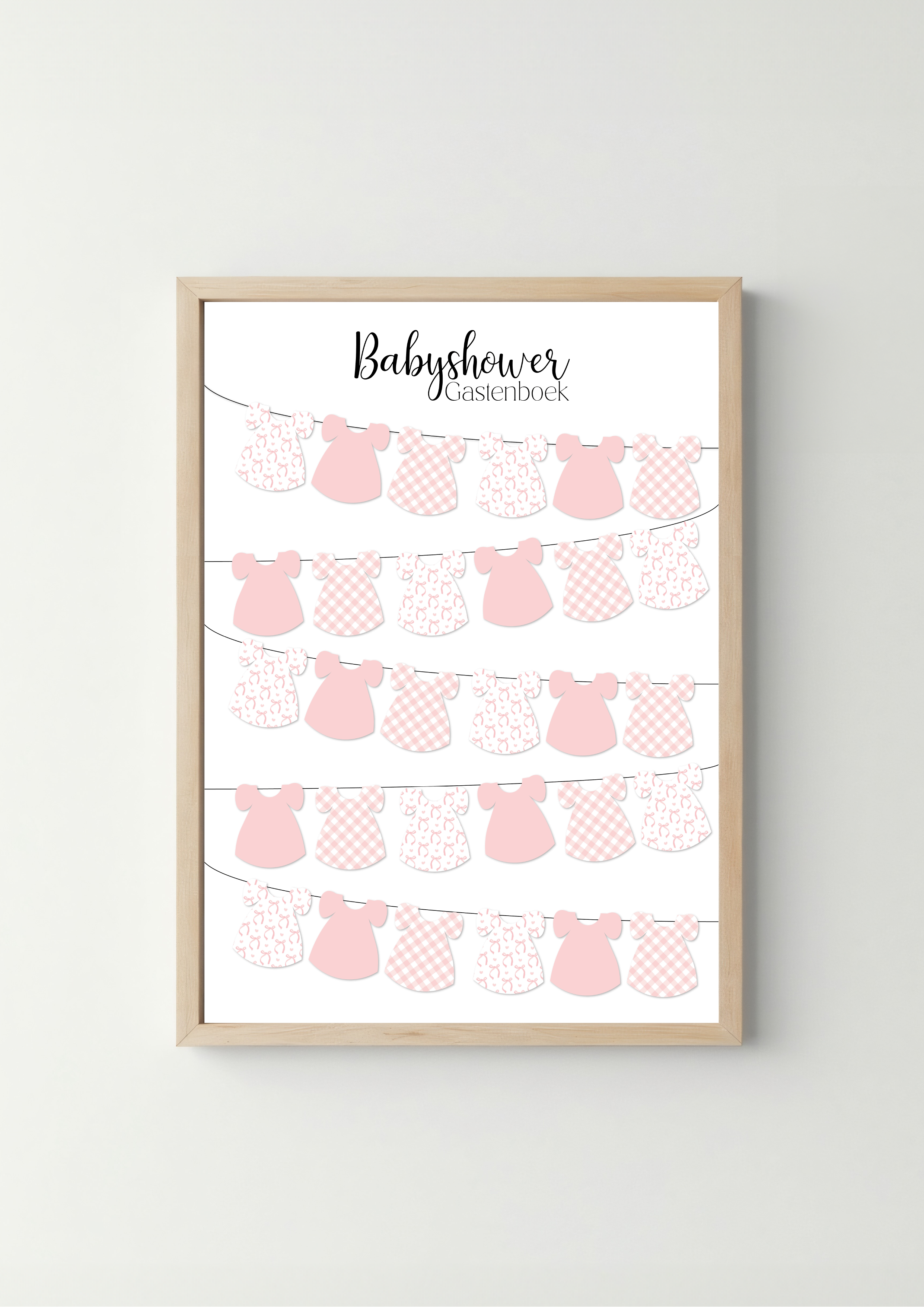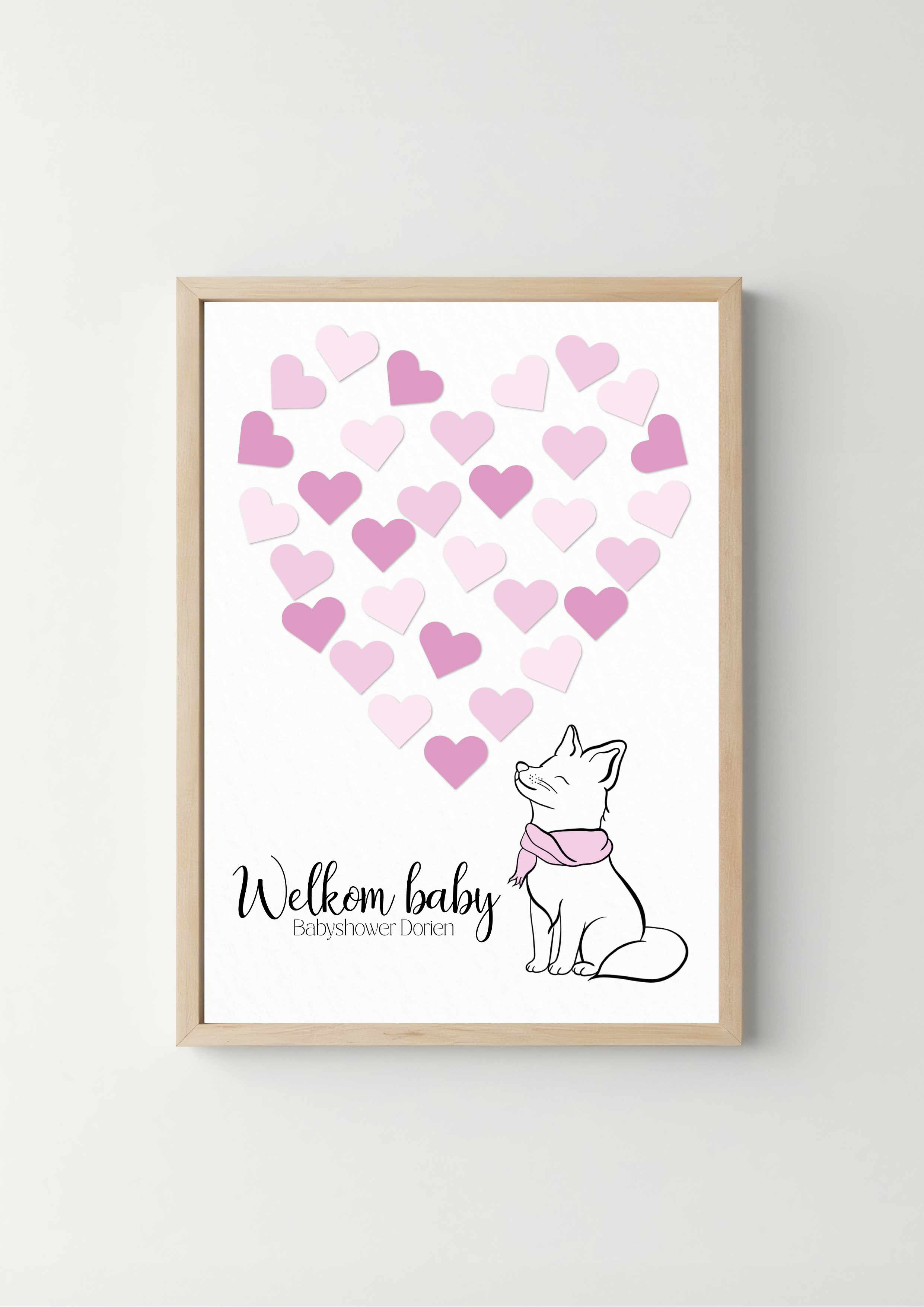 Deze welkomstposter in zachte roze tinten heet de gasten op een warme en vrolijke manier welkom. De naam is te personaliseren, waardoor de poster helemaal past bij de babyshower en later leuk is om te bewaren.