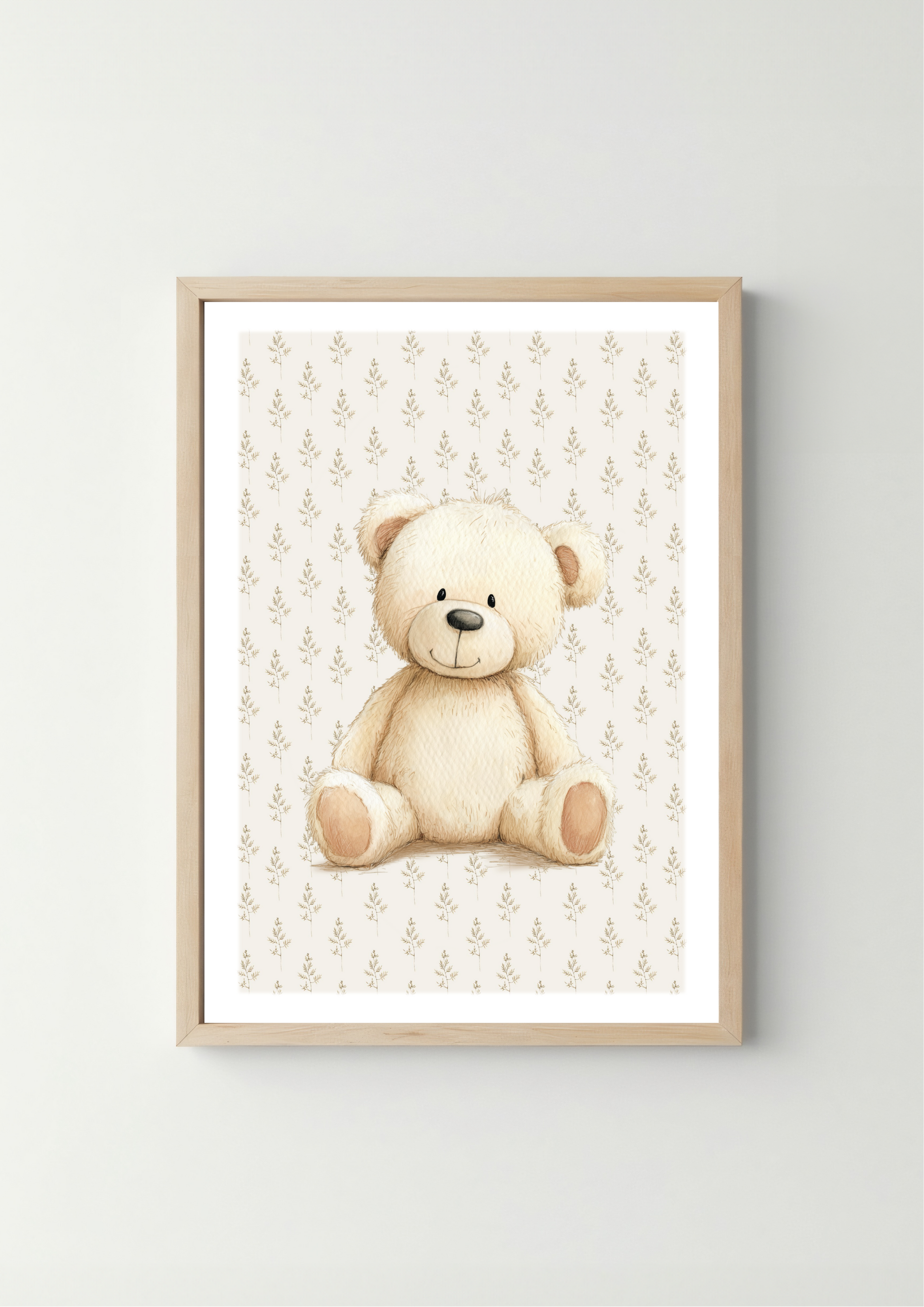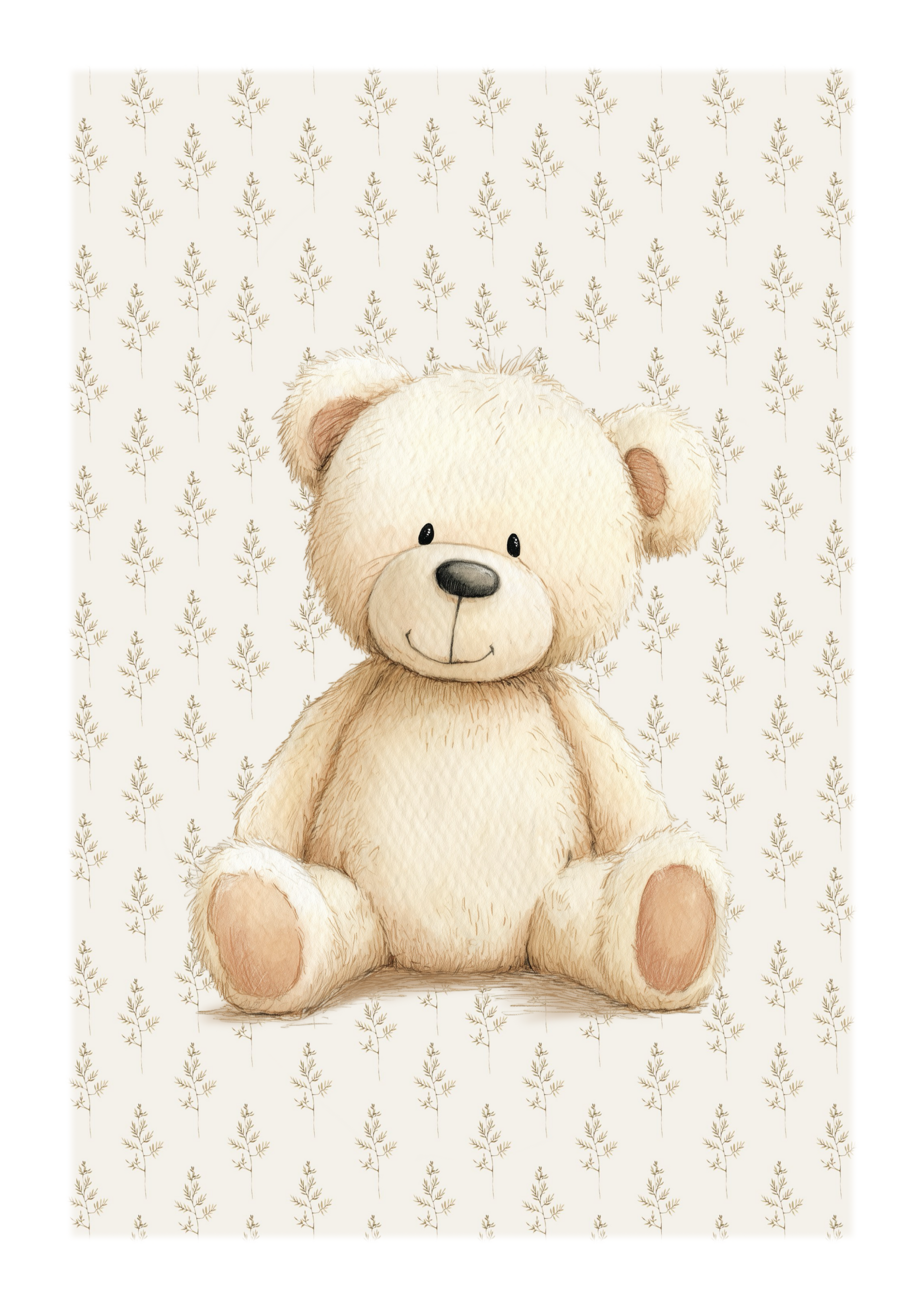 Deze lieve vintage poster met een schattige beer op een zachte beige achtergrond met klassieke bloemen. De combinatie van het warme kleurenpalet en de subtiele bloemendetails geeft de print een nostalgische, dromerige uitstraling.