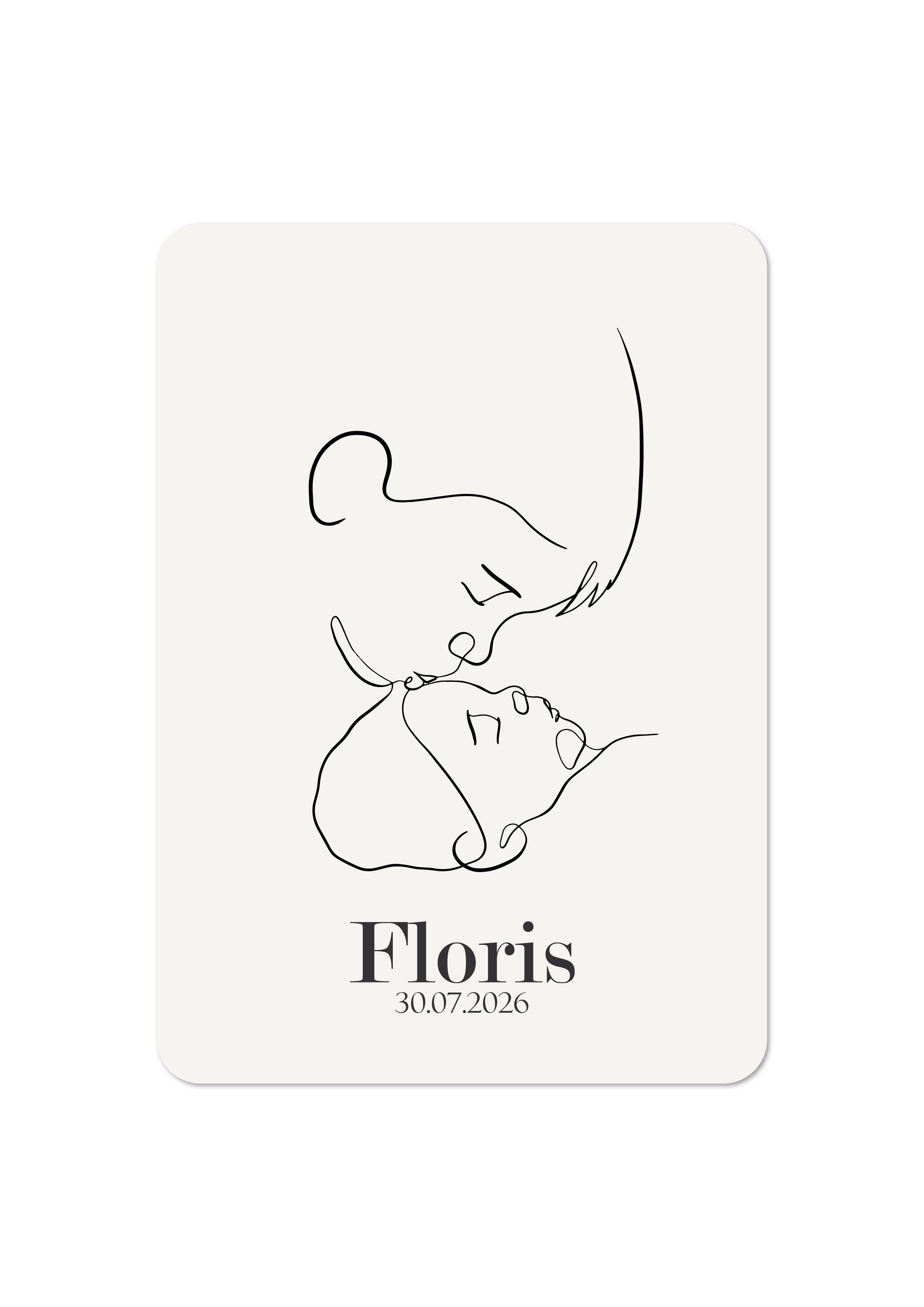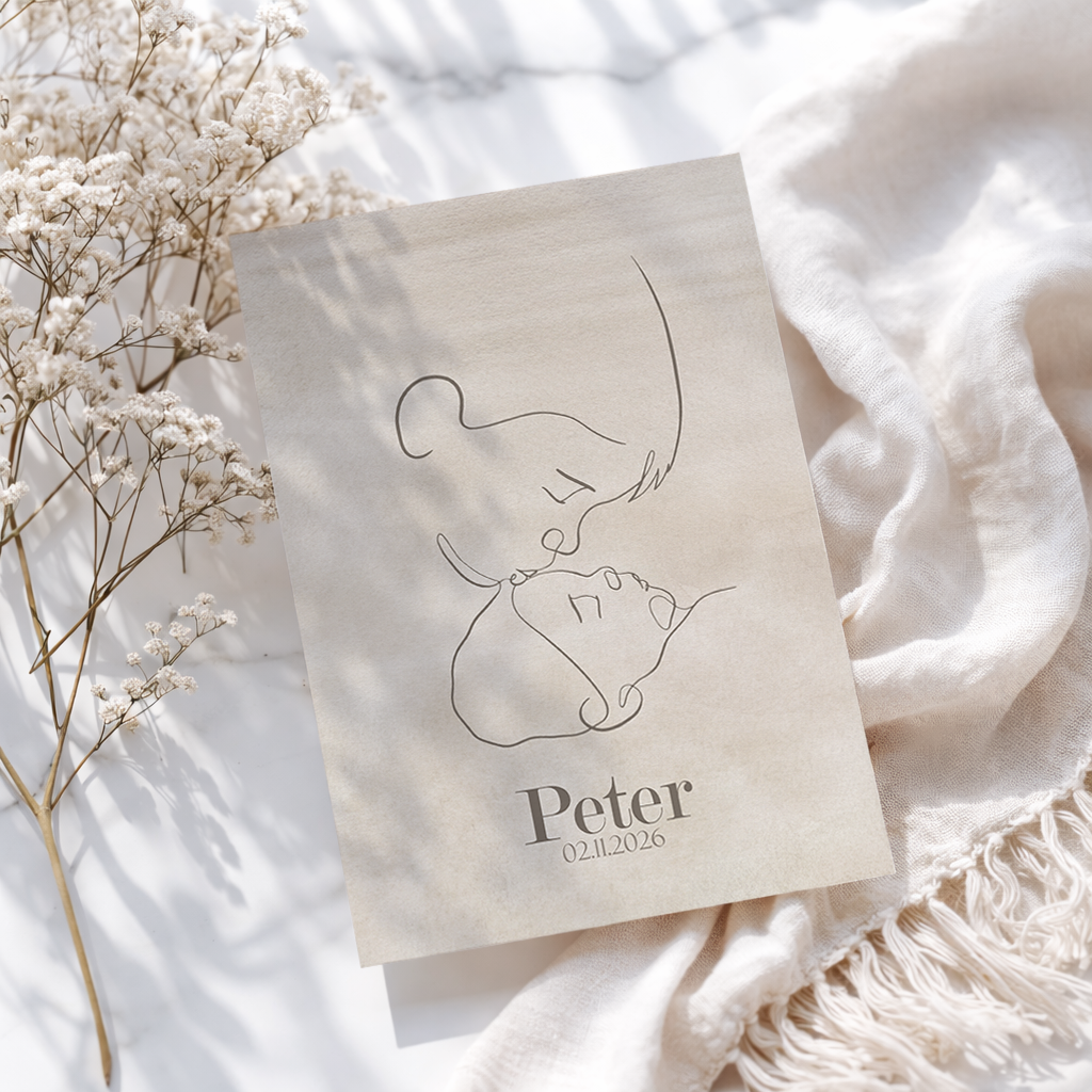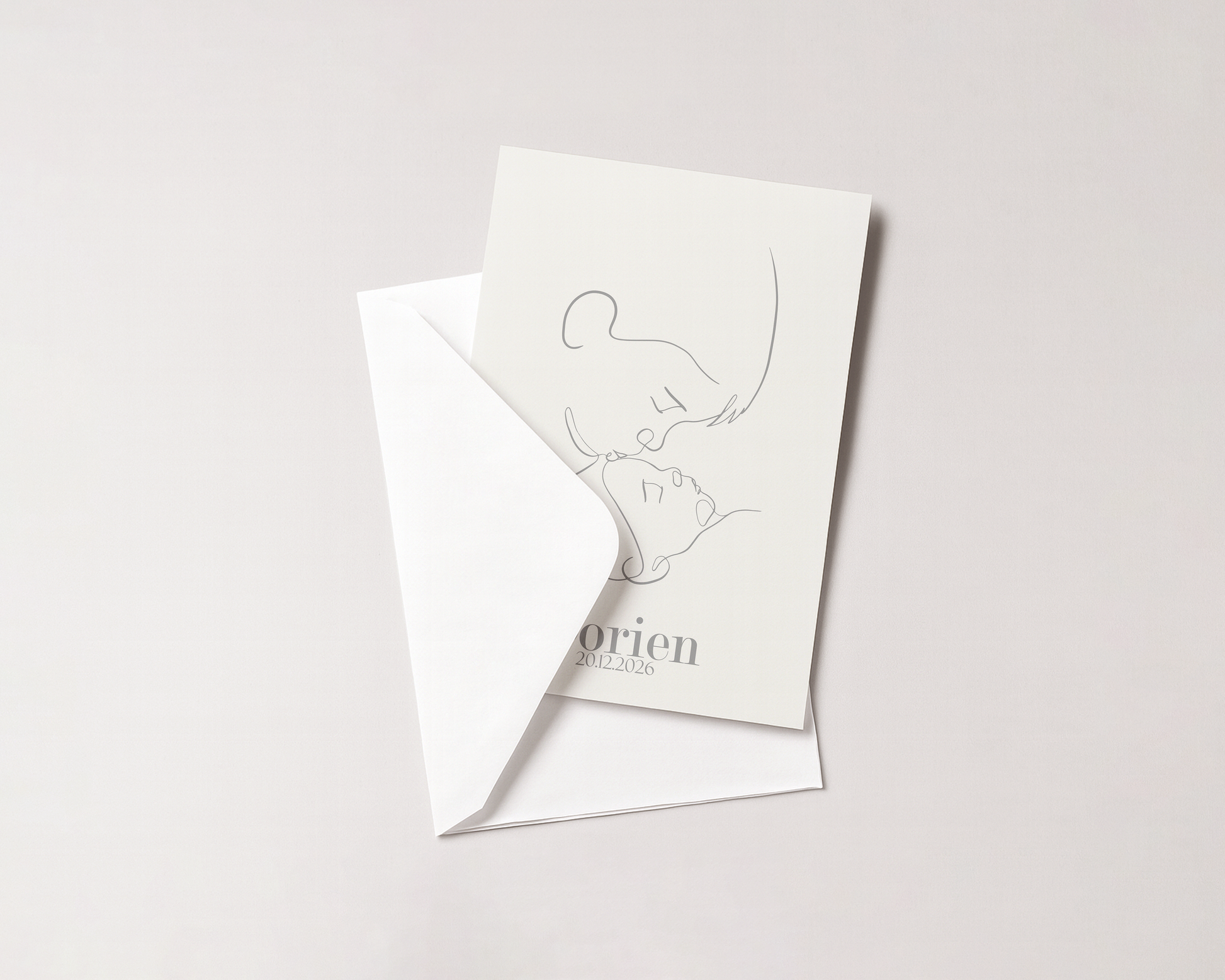 Teksten, kleuren en geboortegegevens worden volledig aangepast aan jouw wensen, zodat het kaartje perfect aansluit bij jullie stijl. De tekening staat vast in het ontwerp.