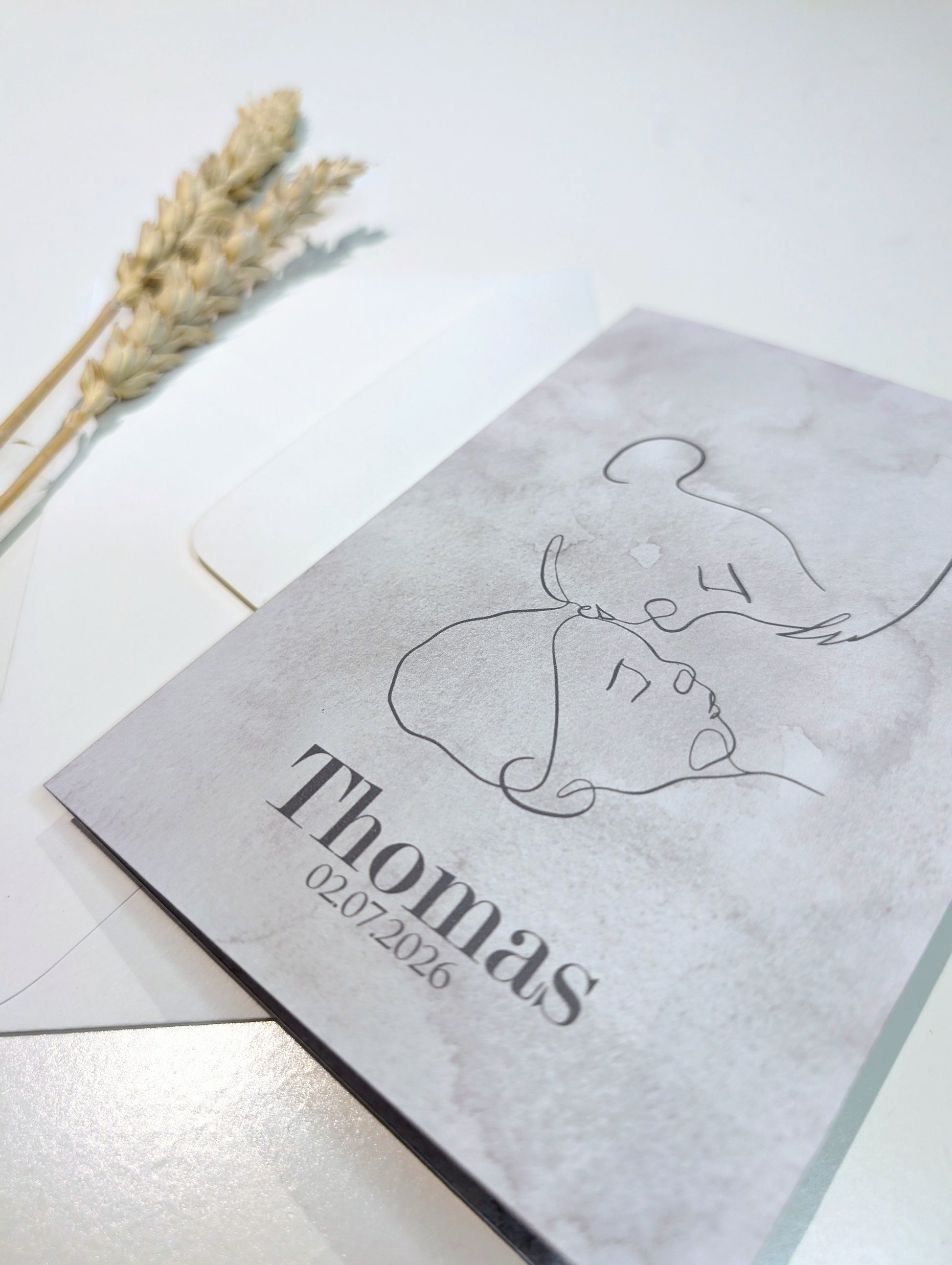 Dit minimalistische geboortekaartje laat een teder moment zien tussen twee kinderen: een broertje dat de baby een kusje geeft.