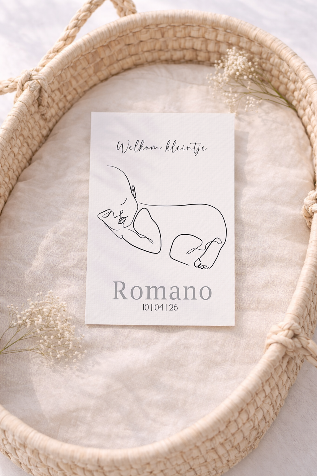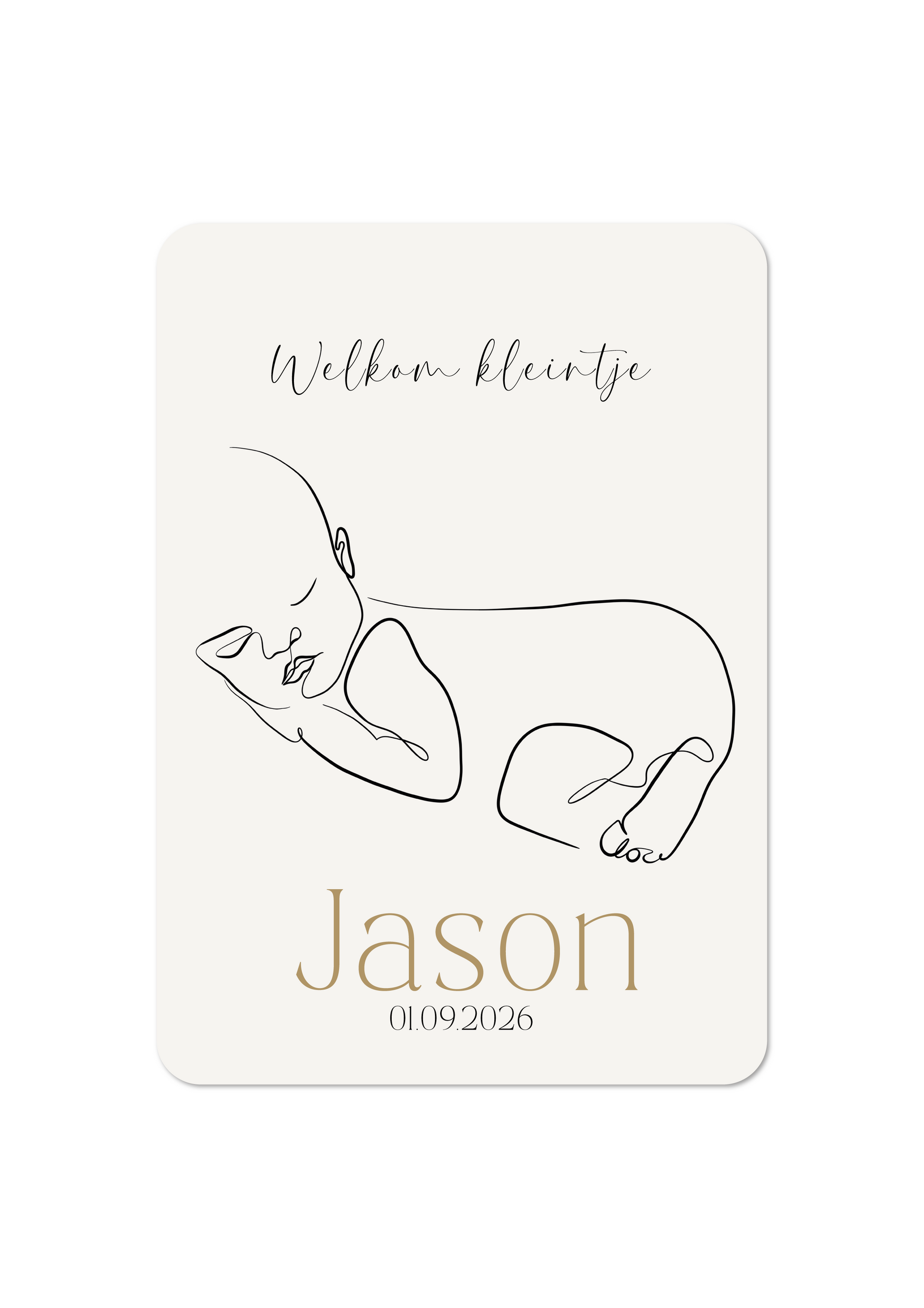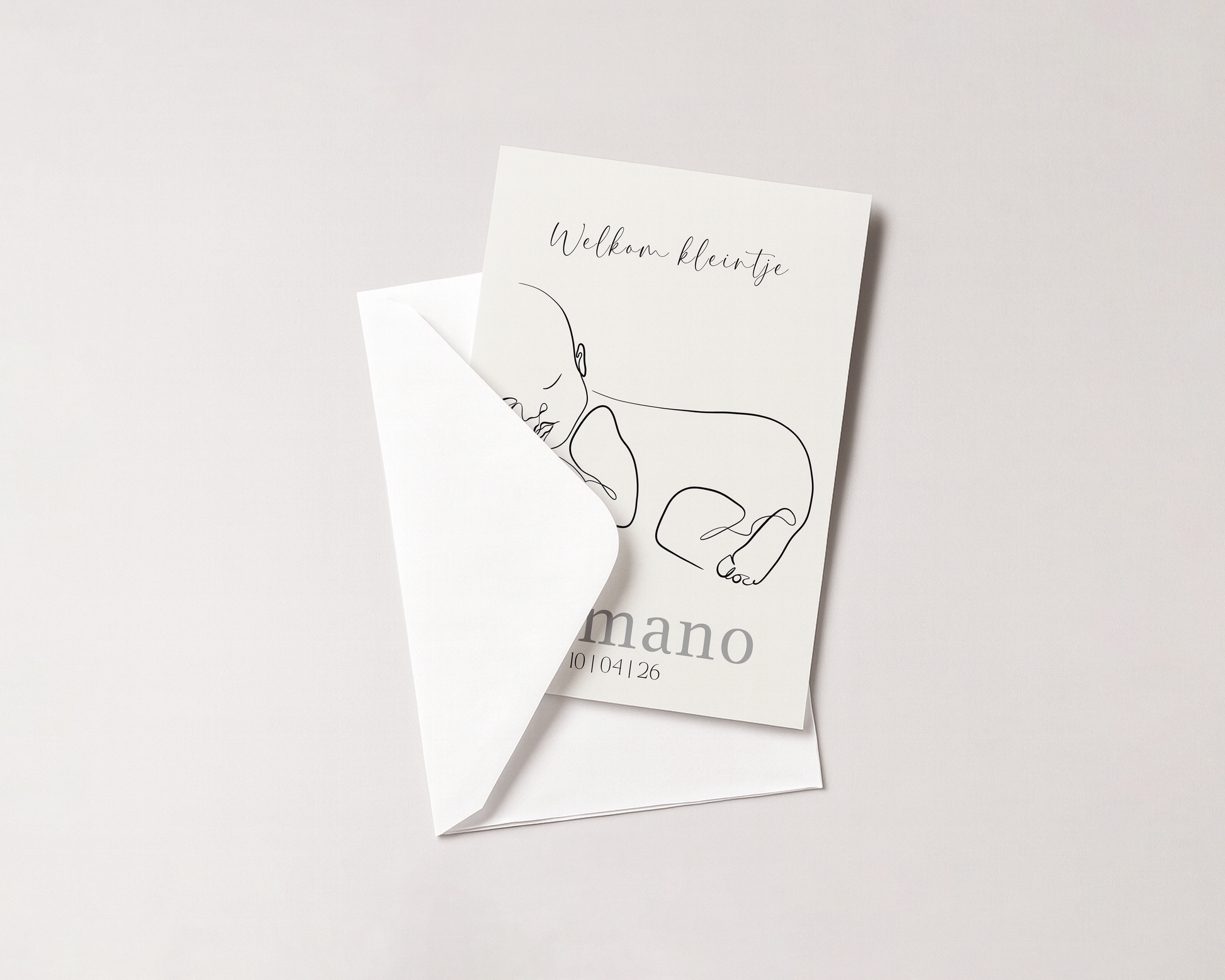 Dit geboortekaartje toont een vaste, minimalistische lijntekening van een slapende baby. De illustratie blijft ongewijzigd en vangt een moment van stilte en geborgenheid.
