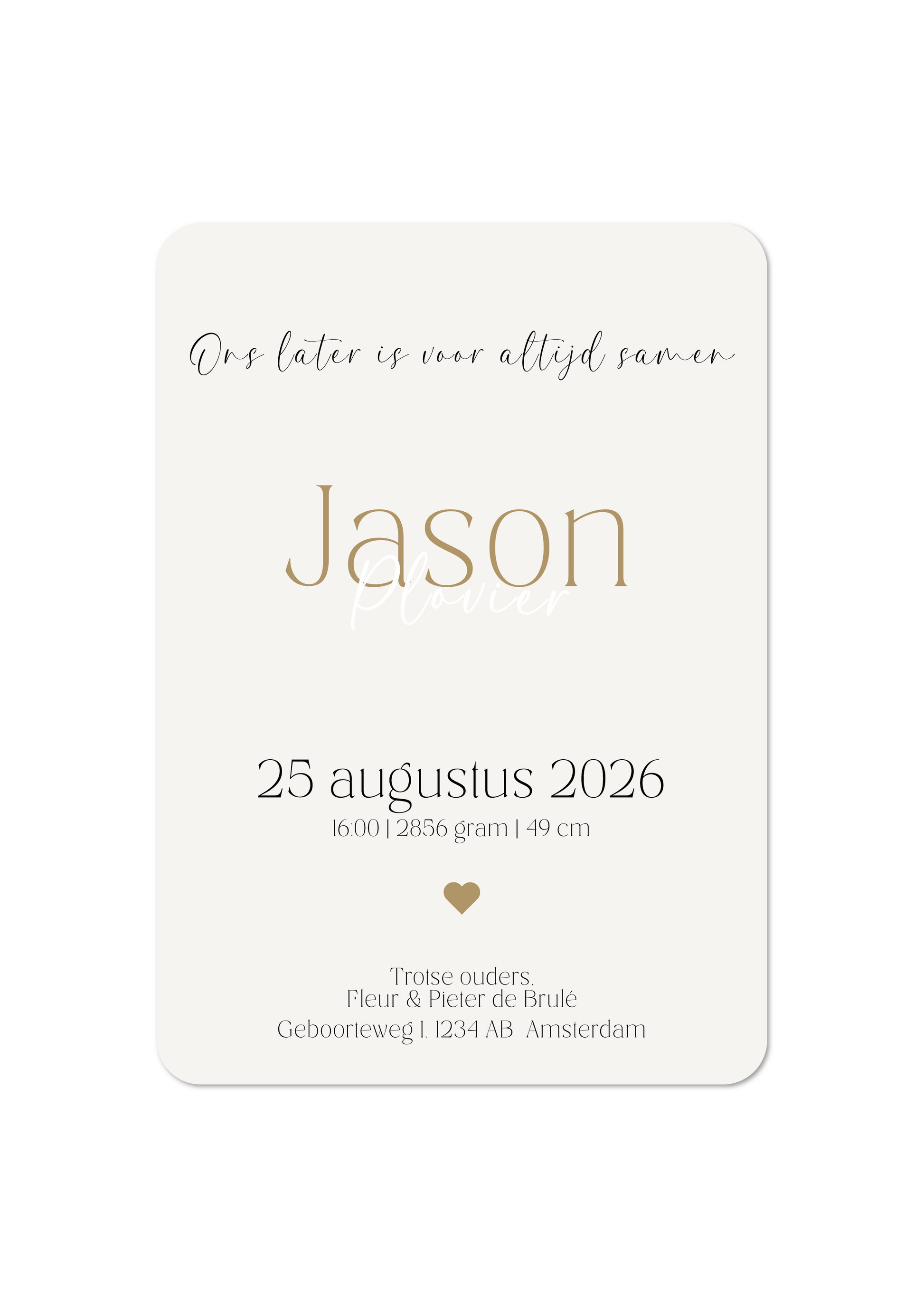 Teksten, kleuren en geboortegegevens worden volledig aangepast aan jouw wensen, zodat het kaartje perfect aansluit bij jullie stijl.