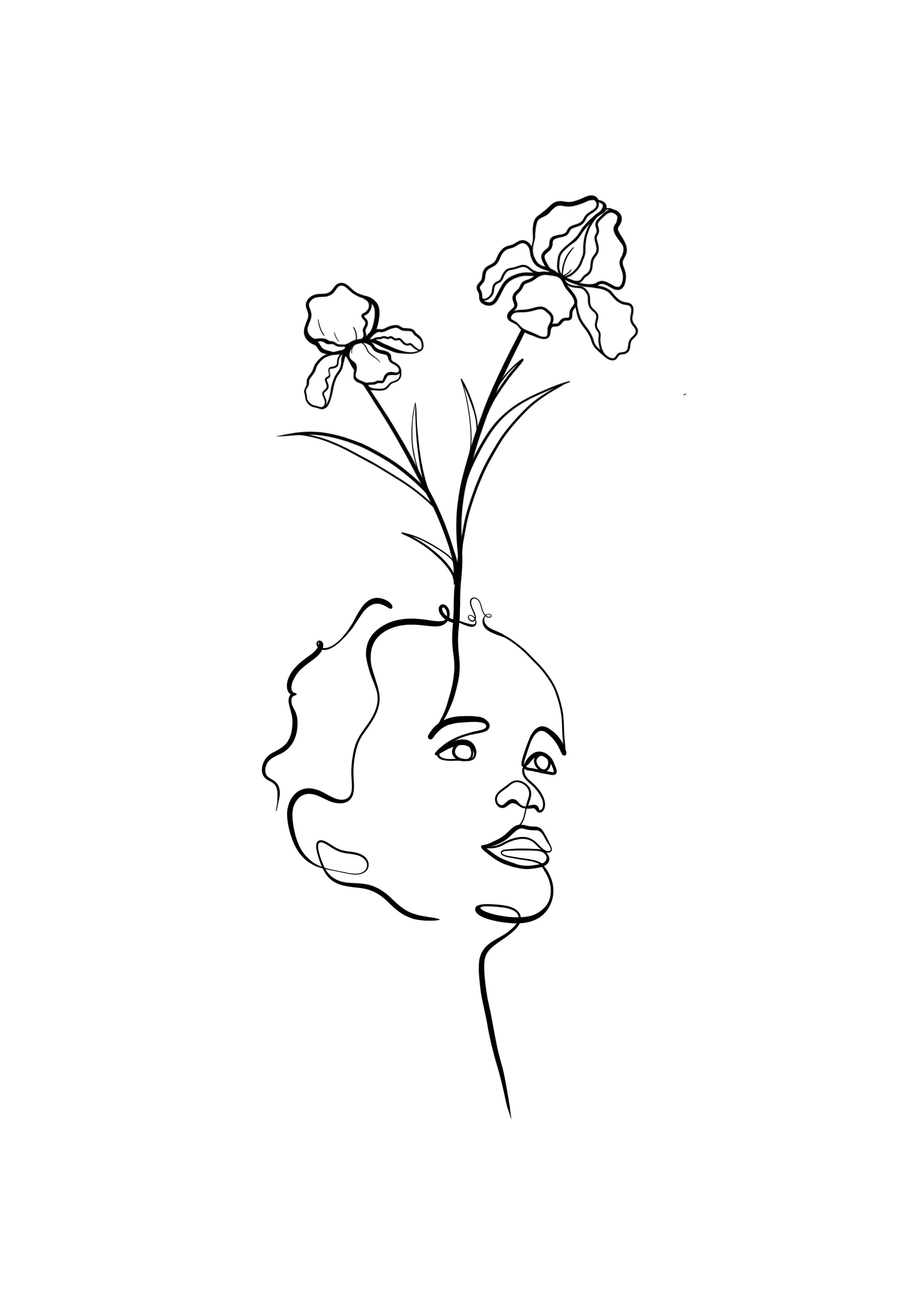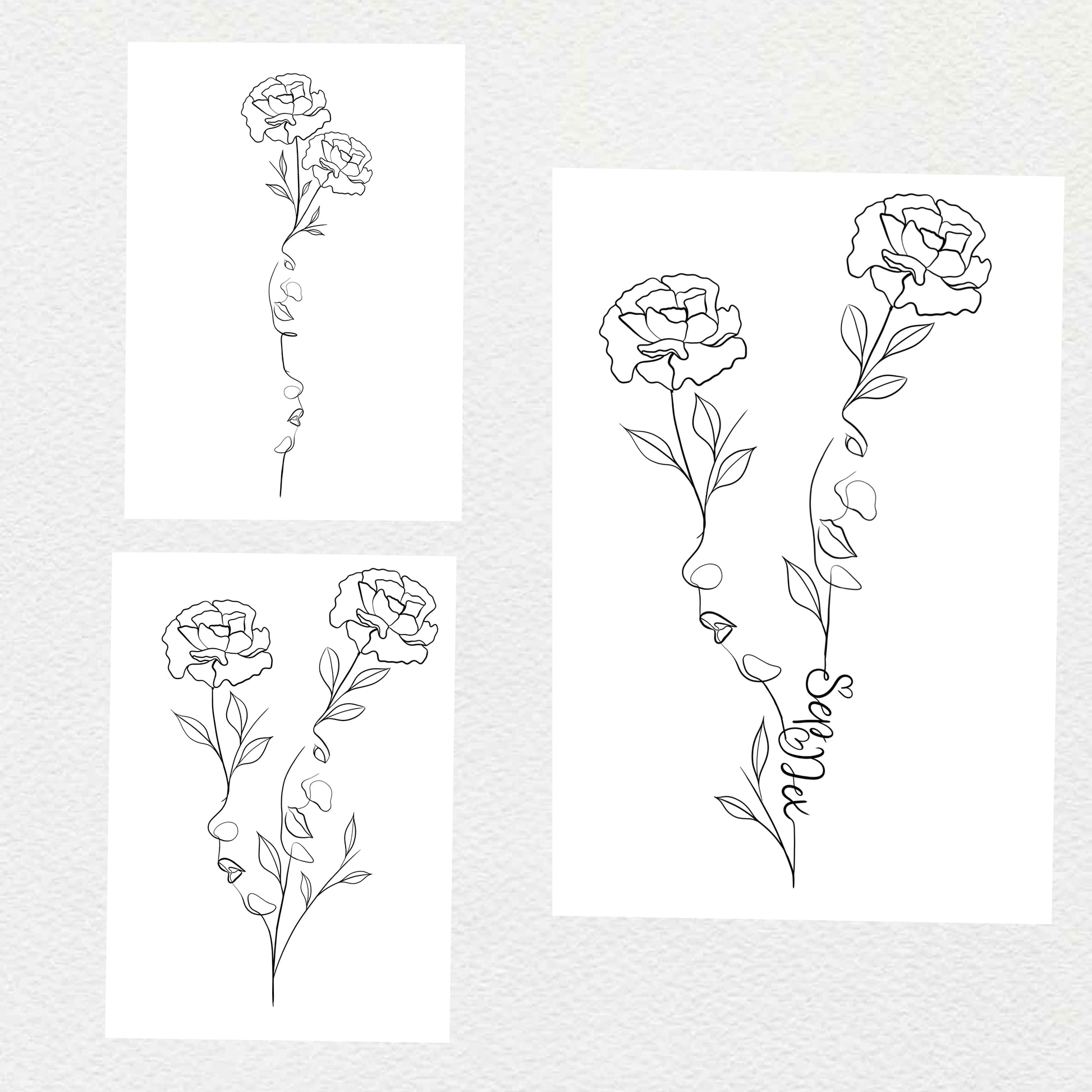 Op zoek naar een unieke geboortebloem tattoo met persoonlijke betekenis? Deze line art illustratie is speciaal ontworpen als tattoo ontwerp op maat. Je kunt kiezen voor een minimalistisch ontwerp met alleen geboortebloemen, of een meer persoonlijke variant met een gezicht, een naam, of beide.