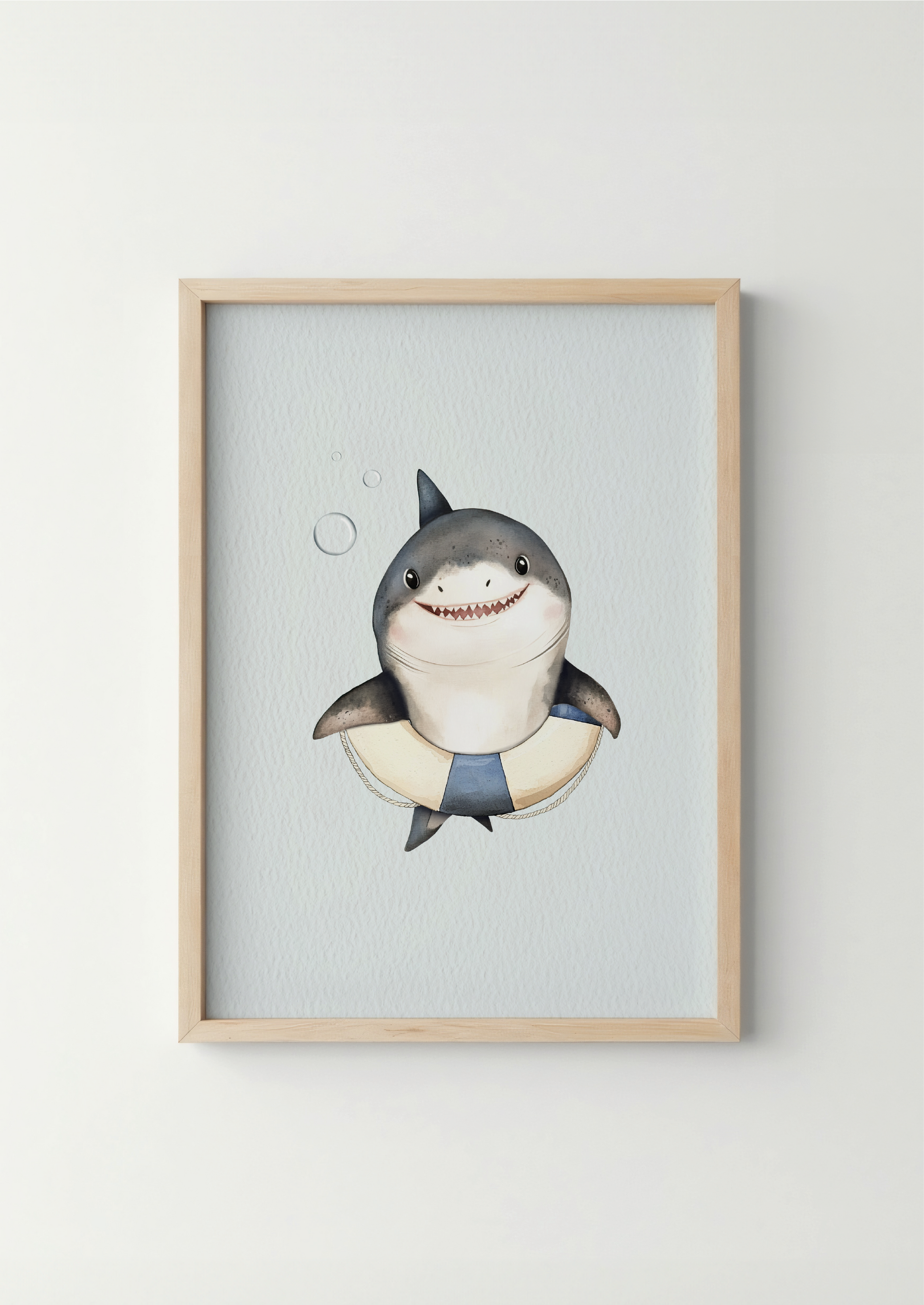 Een haai met een boei en een lieve glimlach, die speels door de zee zwemt. Een uniek en charmant ontwerp vol speelsheid en warmte.