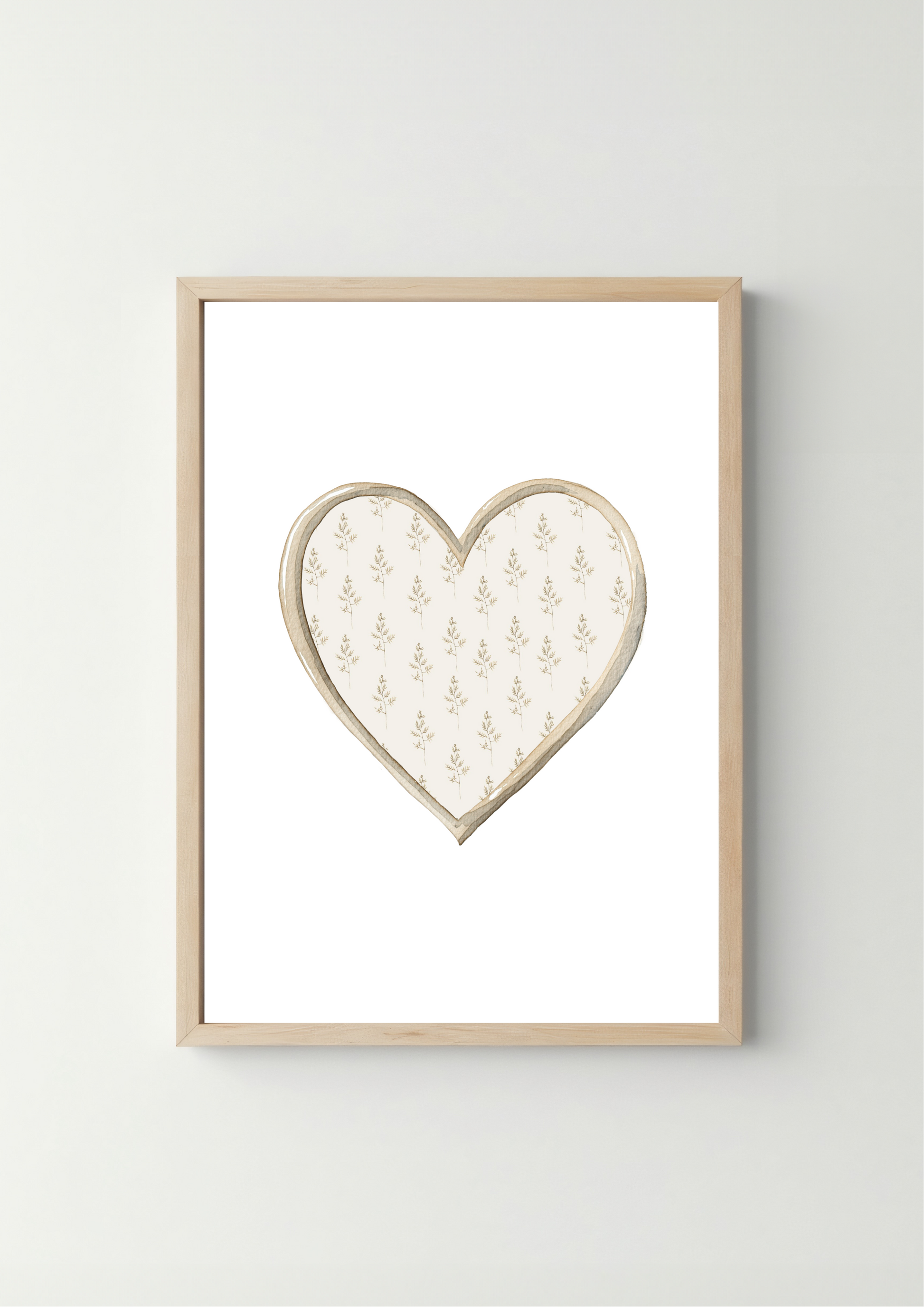Een lieflijke vintage poster met een zacht beige hart, gevuld met subtiele bloemen. De delicate bloemetjes geven het ontwerp een warme, romantische uitstraling. De beige tinten en vintage details brengen rust, zachtheid en een vleugje nostalgie.