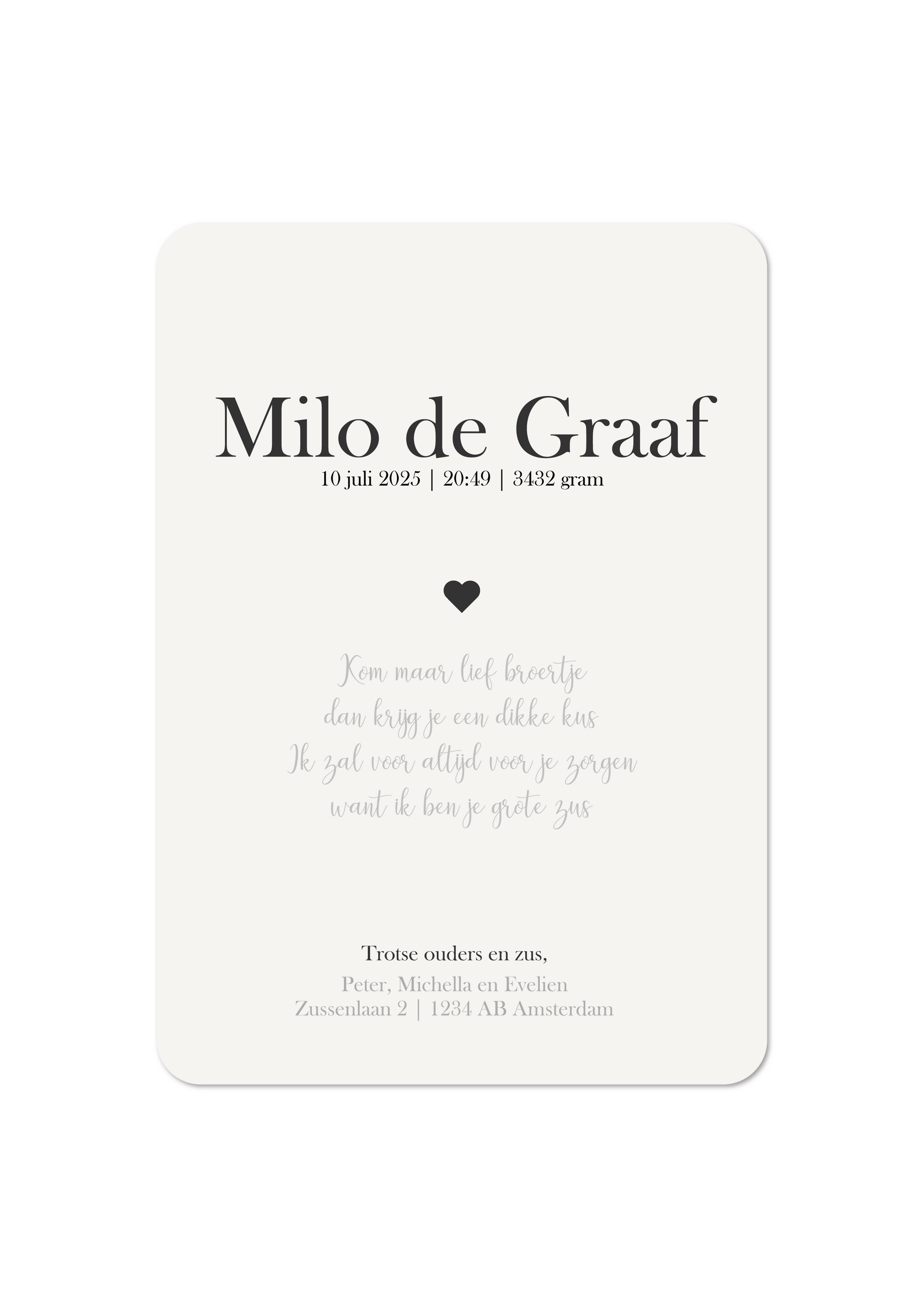Teksten, kleuren en geboortegegevens worden volledig aangepast aan jouw wensen, zodat het kaartje perfect aansluit bij jullie stijl.