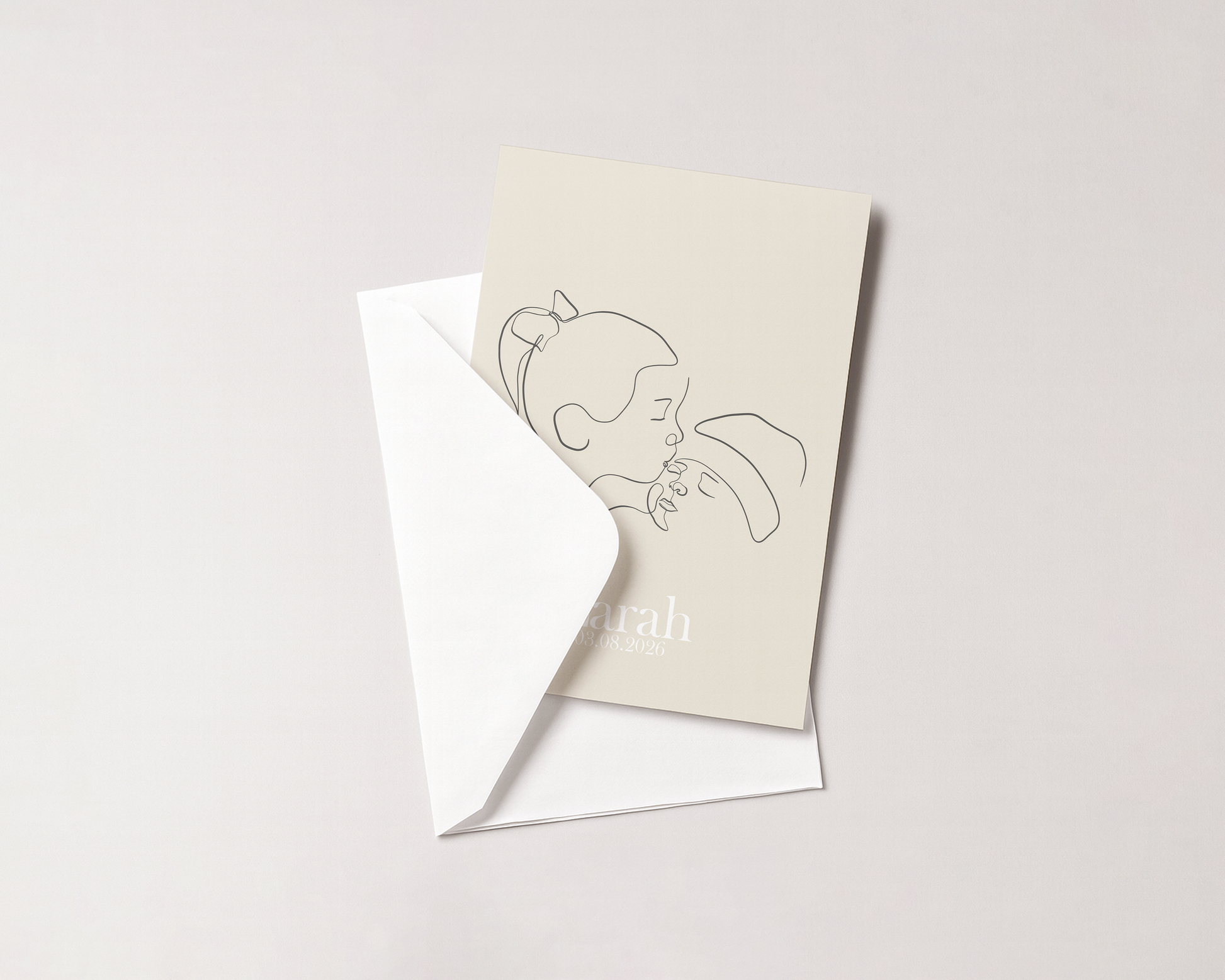 Dit geboortekaartje heeft een vaste, minimalistische lijnillustratie van een baby met zijn of haar zusje. Het zusje geeft een lief en zacht kusje aan de baby.