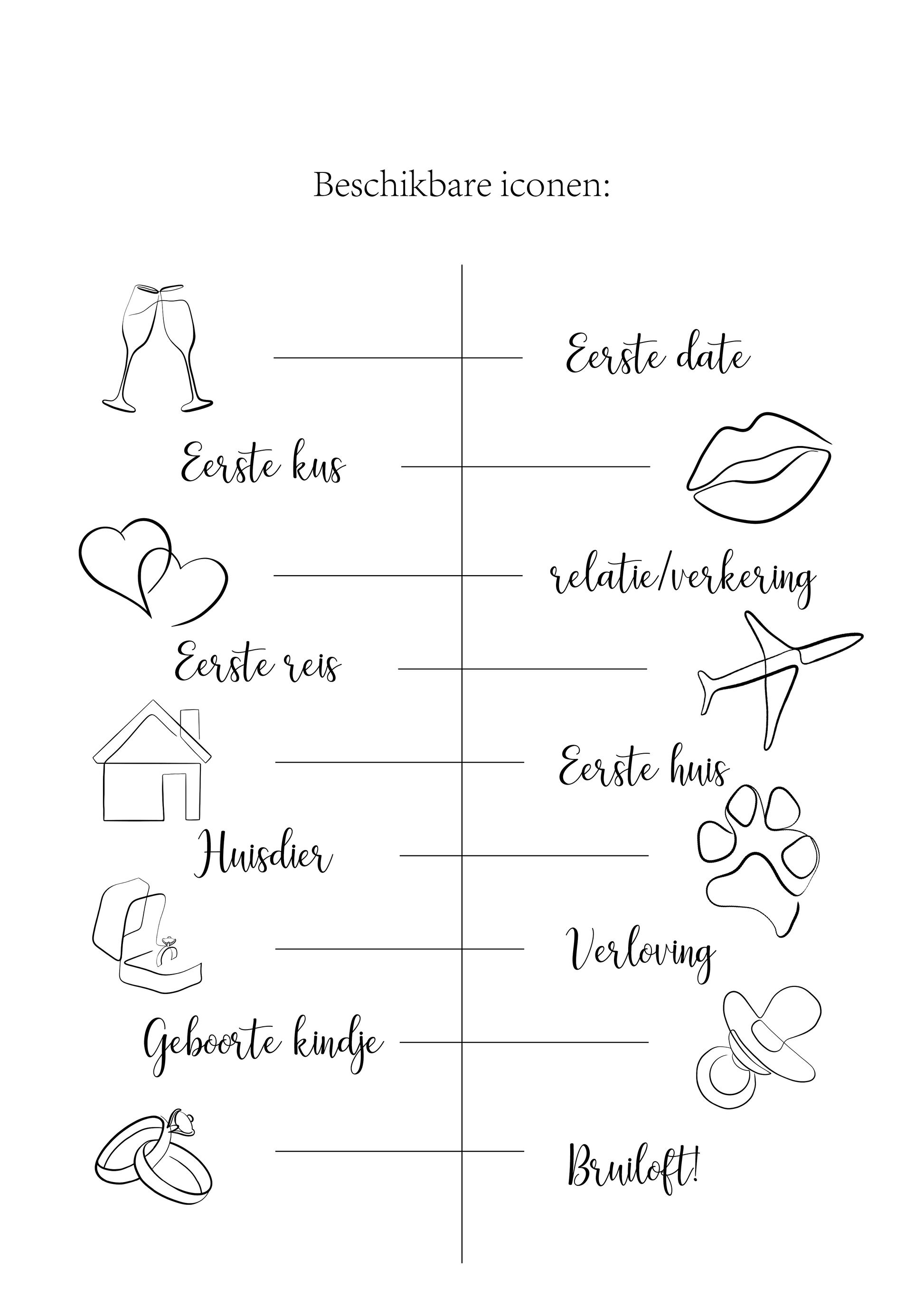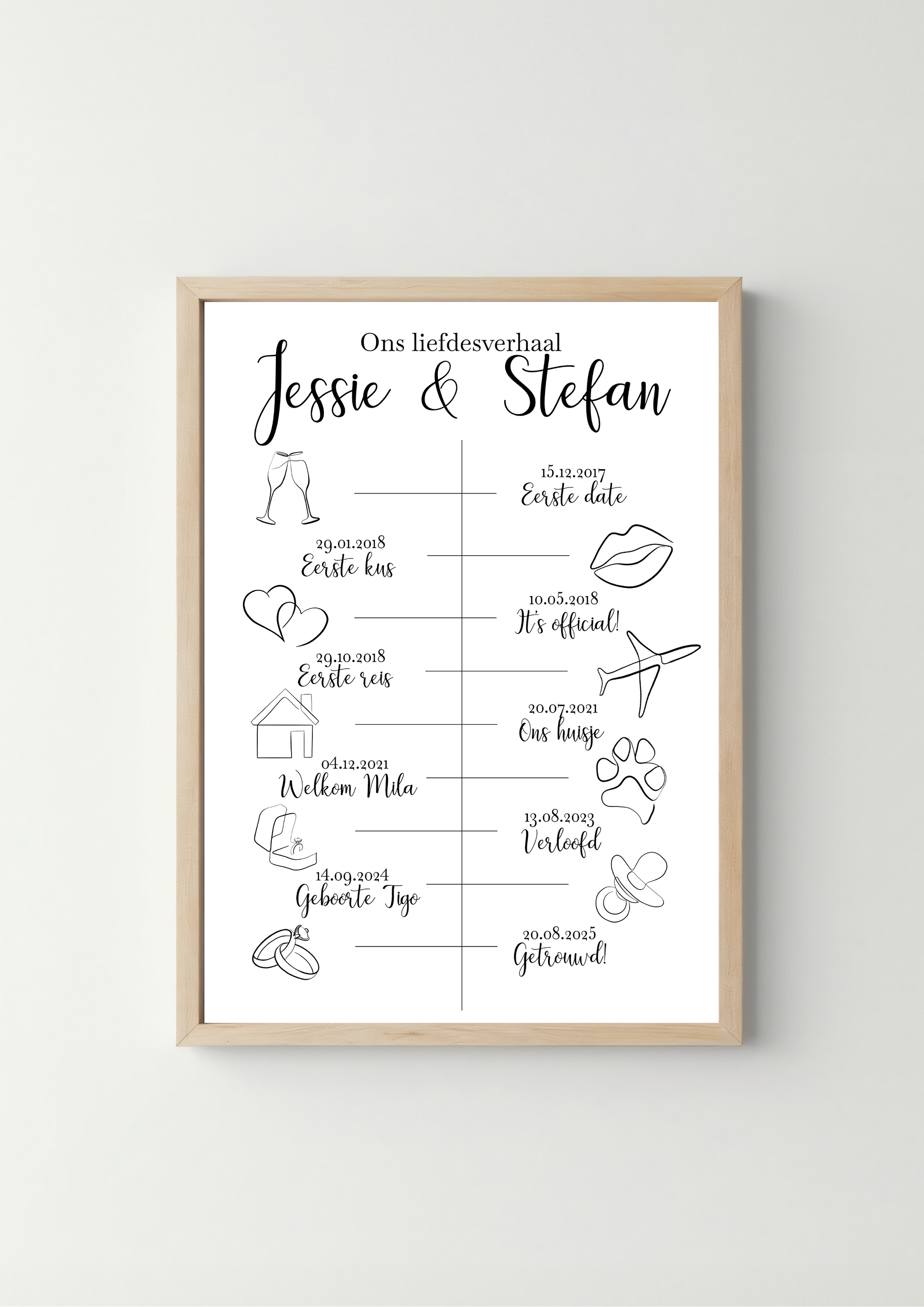 De geselecteerde mijlpalen worden omgezet in een elegante line-art tijdlijn die jullie liefdesverhaal op een unieke en blijvende manier weergeeft.